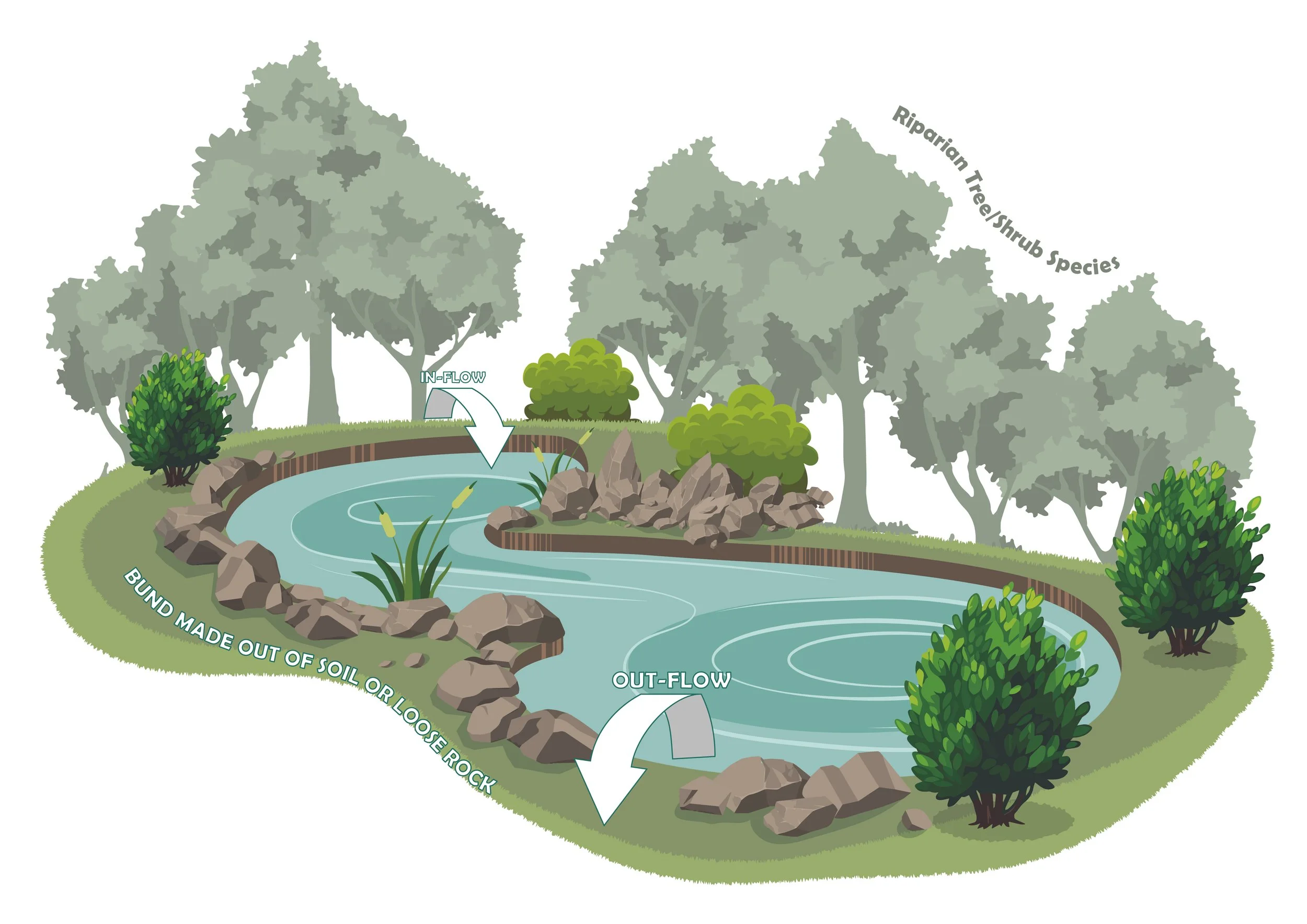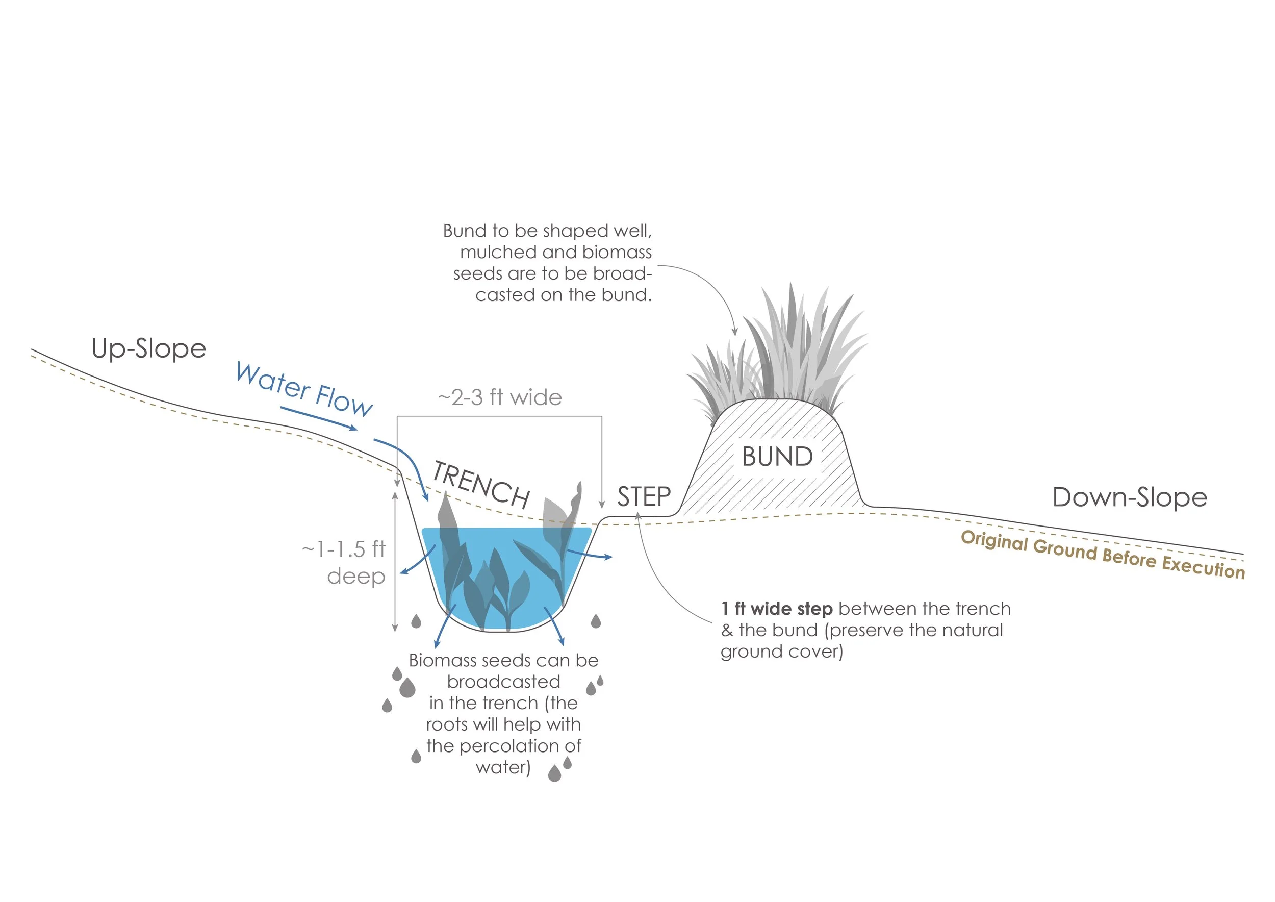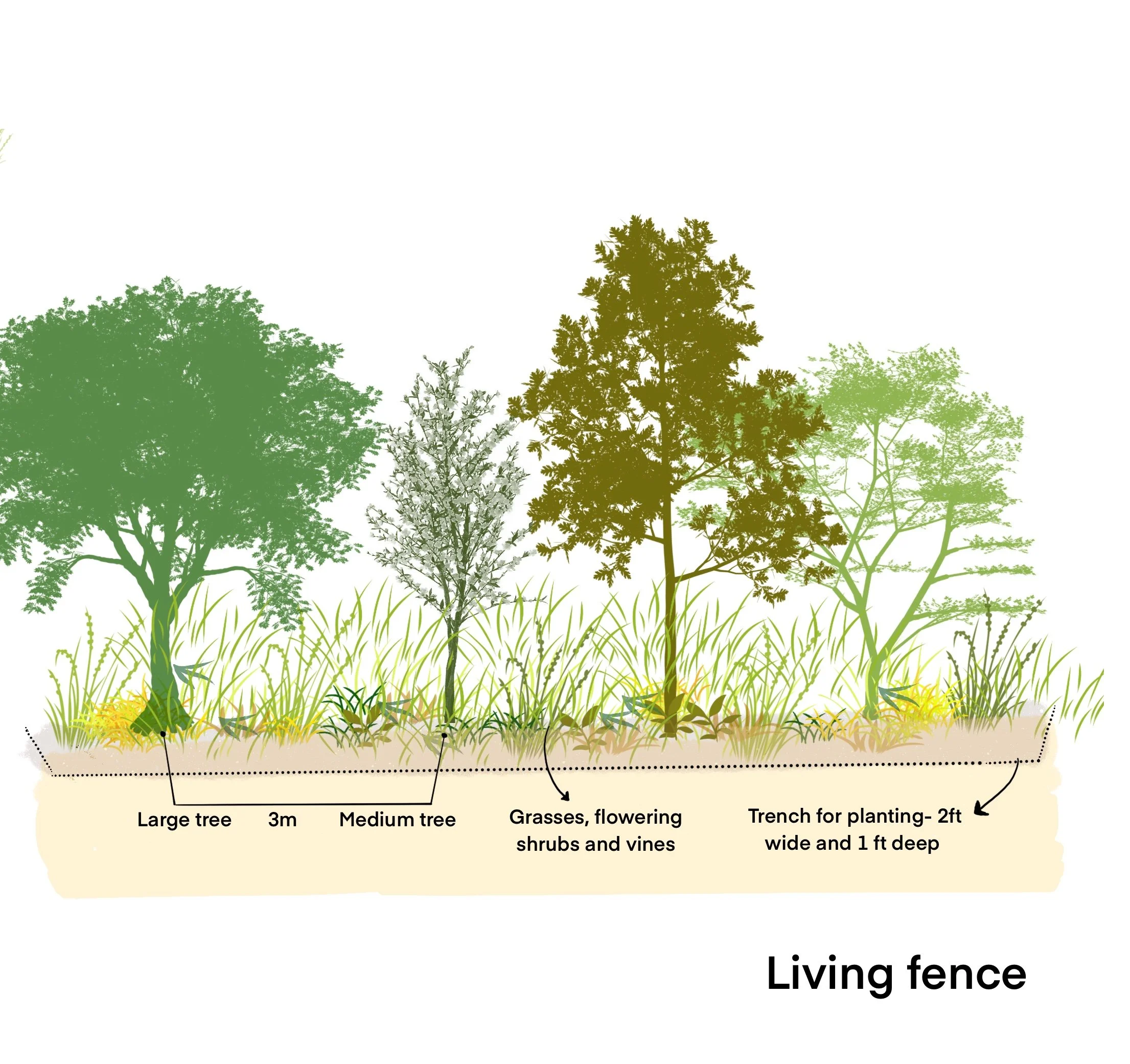 The details of this design help inform the implementation of the various elements on site. The spacing and composition of the species used for the living fence, depths of trenches, height of bunds, shapes of the pond as well as the appropriate water inlets and outlets are conveyed through graphics.