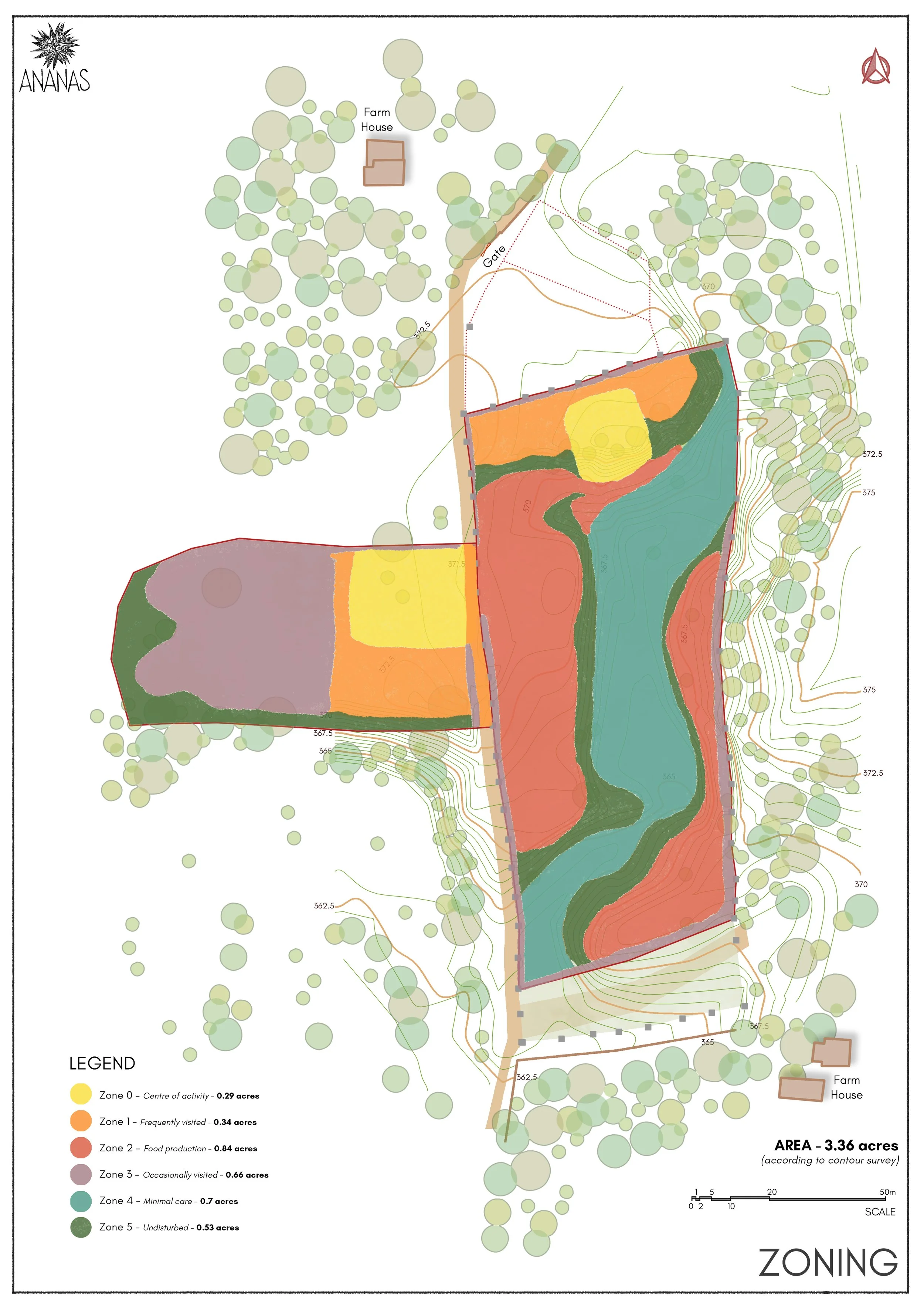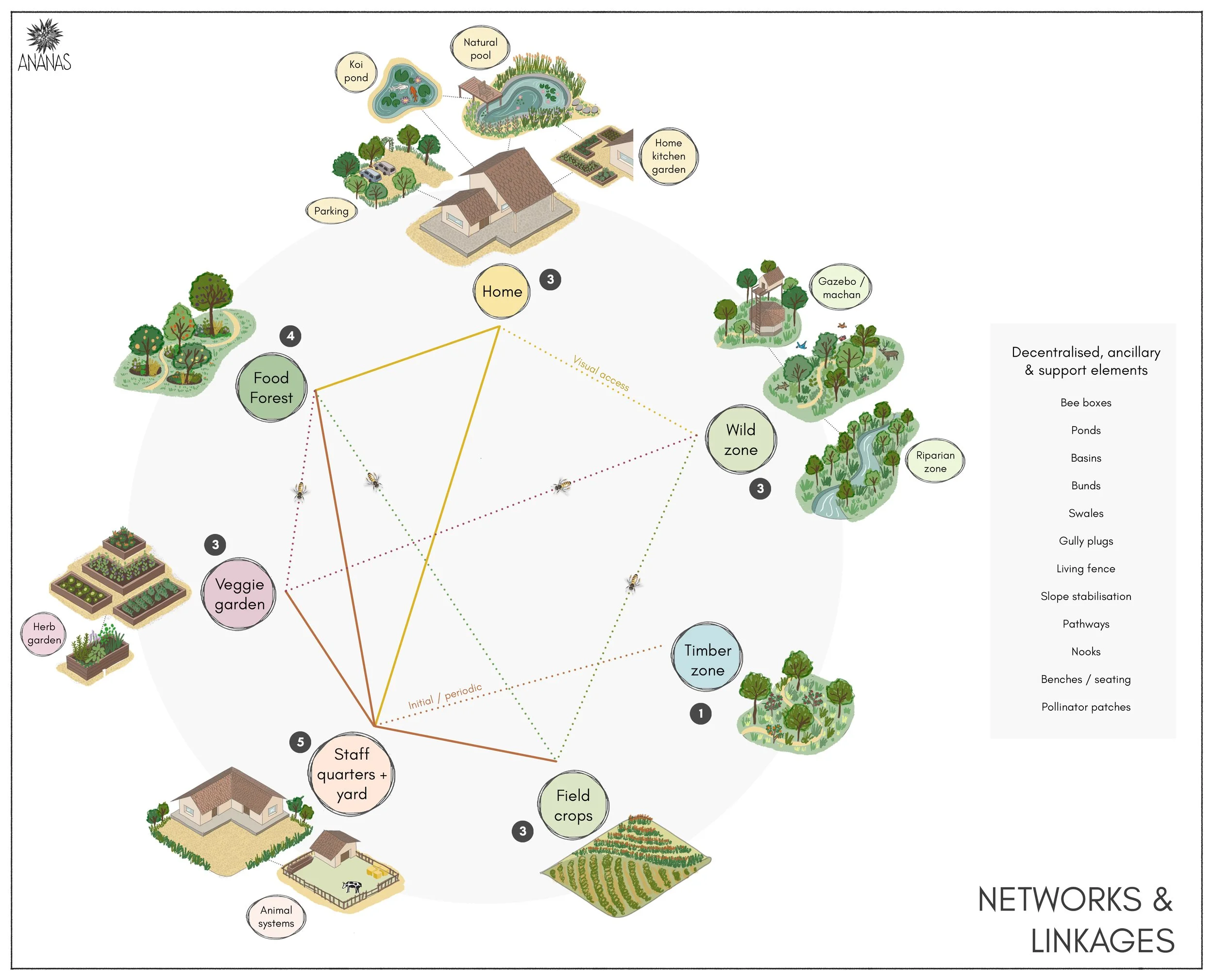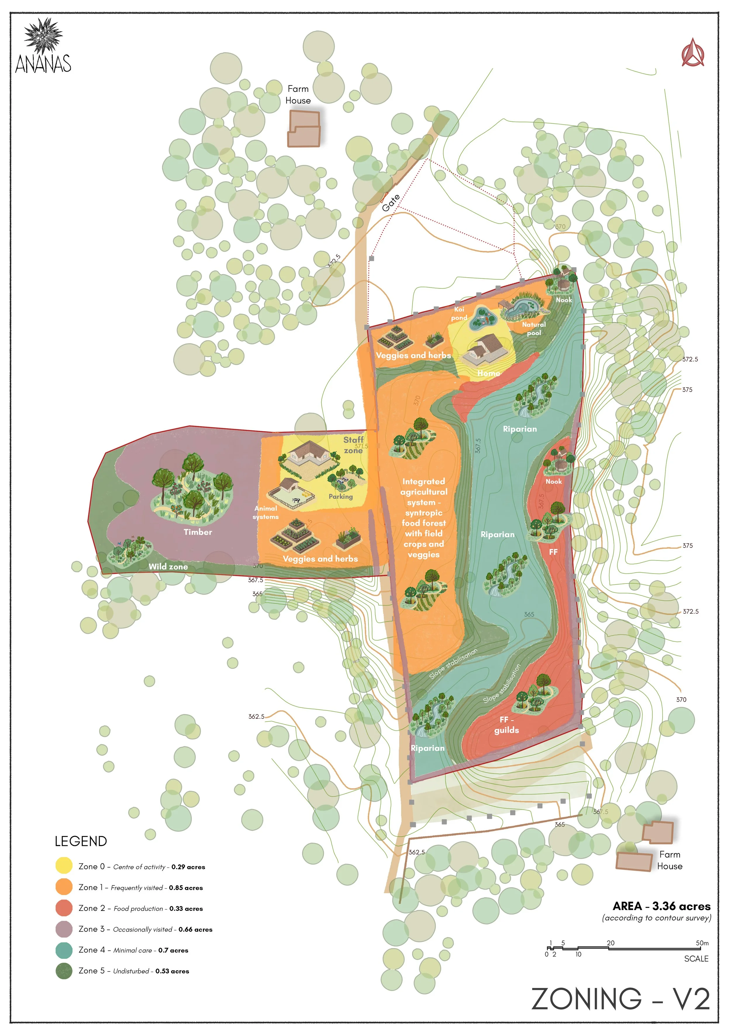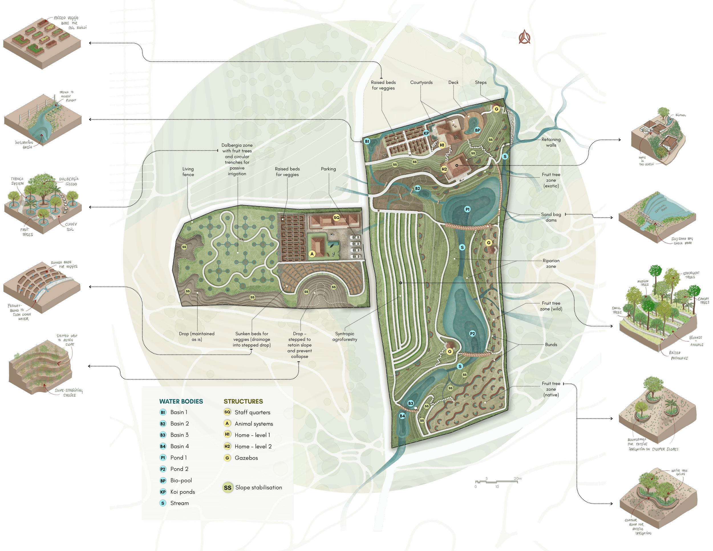 The farm was designed as an integrated landscape where food production and ecological restoration reinforce each other. Zoning followed native vegetation, soil conditions, and natural water flows across the site. Flatter areas were used for cultivation and buildings, while grasses and earthworks were recommended to stabilise steeper slopes. A sediment-carrying stream was treated as an asset, with silt-bag check dams suggested to slow down water, trap silt, and improve groundwater recharge.