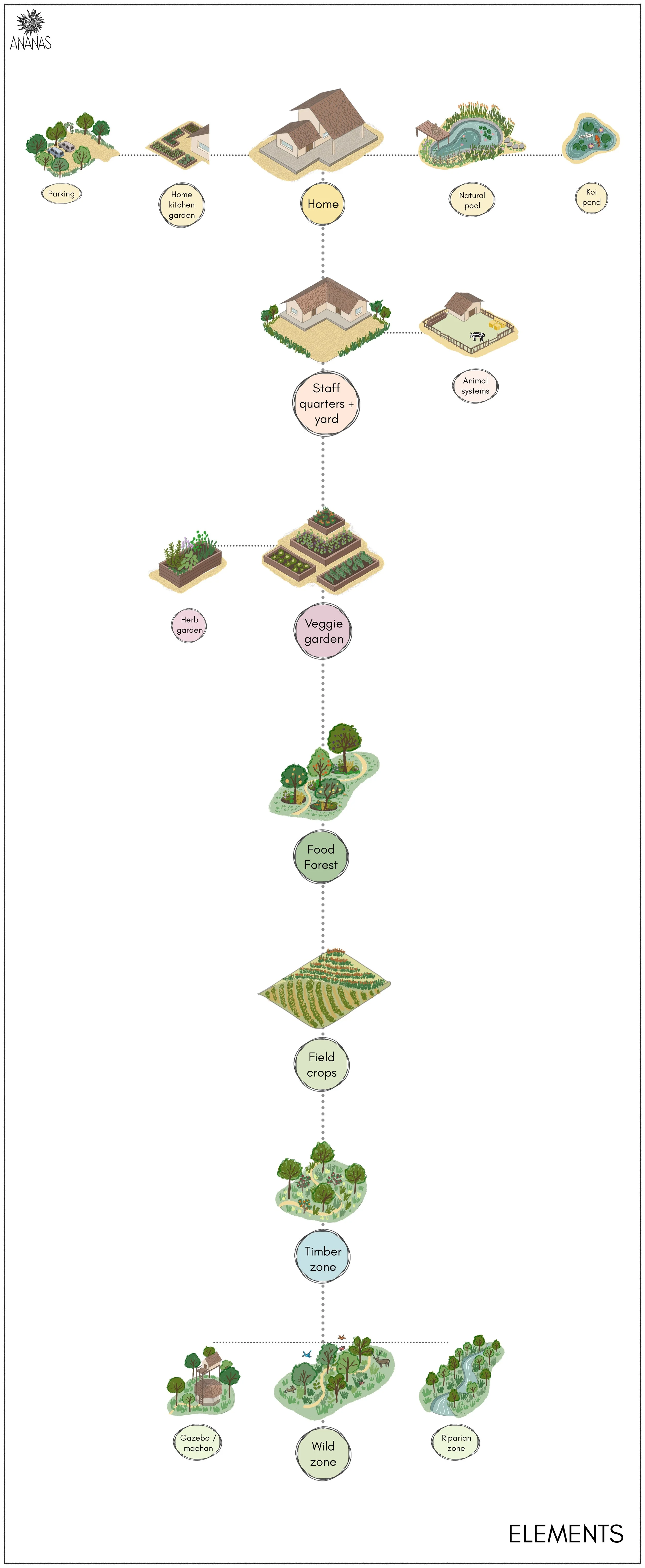 Key features: Syntropic agroforestry, food forest, slope stabilisation, riparian zone, seasonal stream, ponds and basins, on-contour earthworks, timber zone