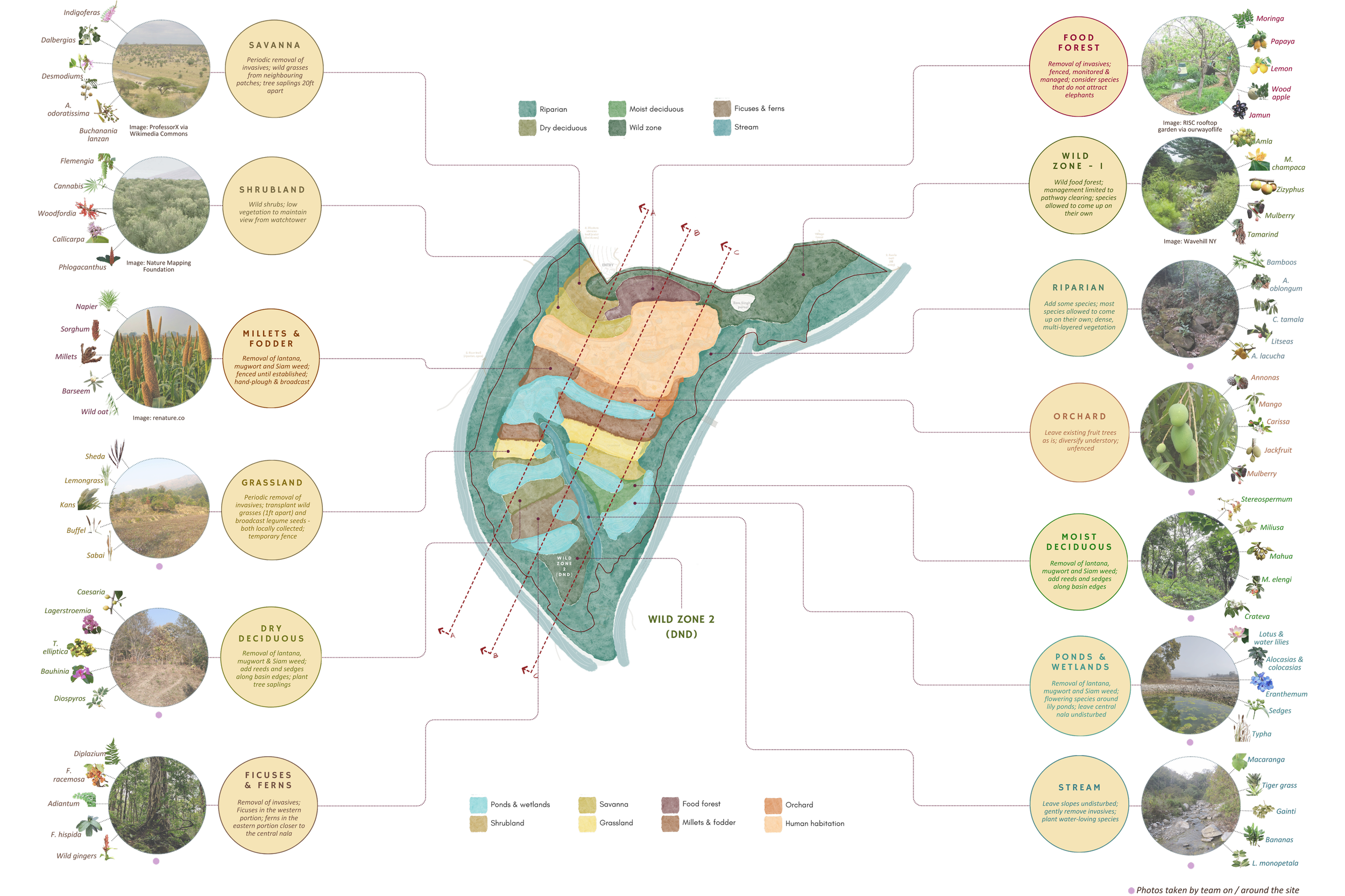 Key features: Rewilding masterplan, eco-resort, wildlife corridors, zoning, wild zones, buffers, grasslands, riparian, elephant pond, decks and machans, trails