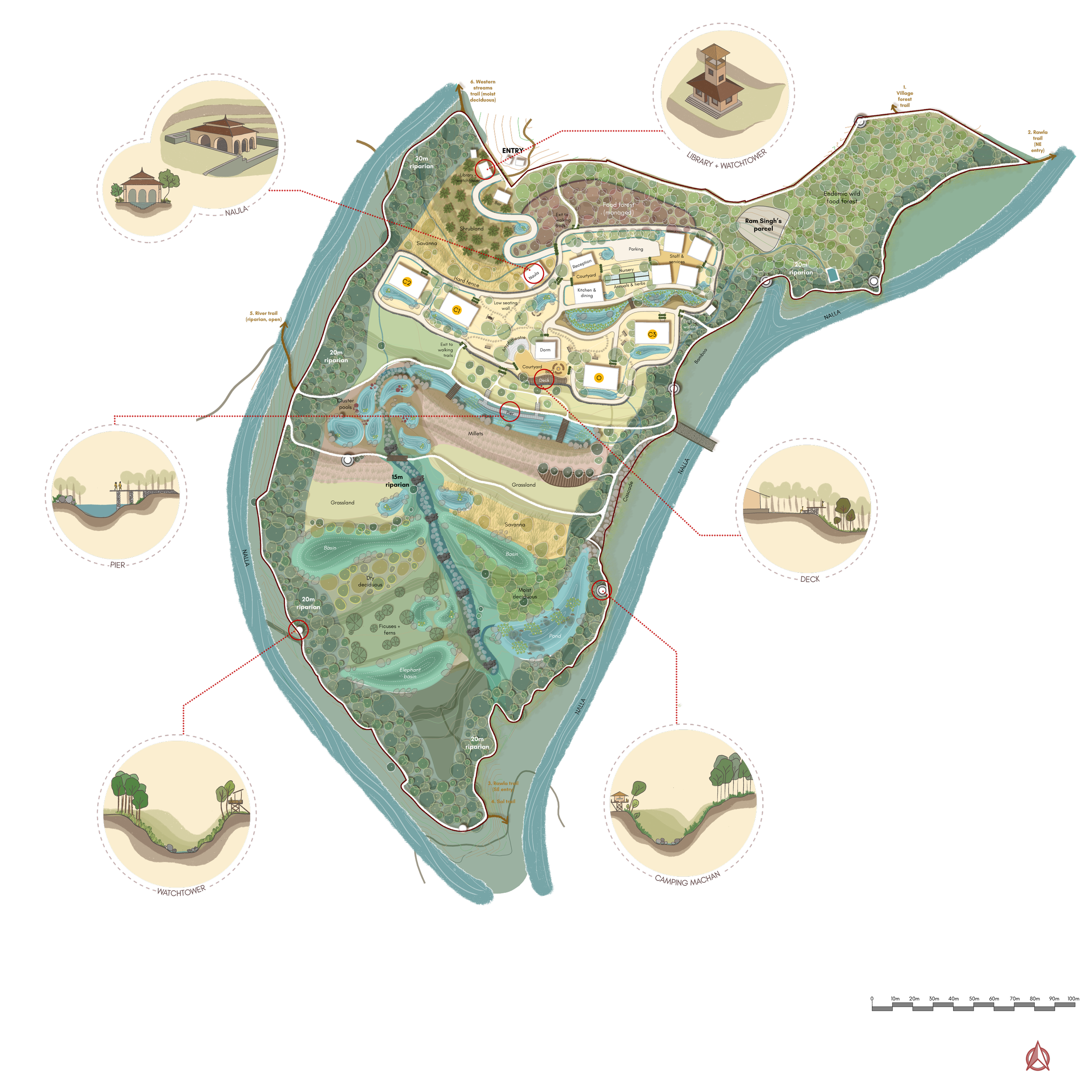 The habitation zone houses luxury cottages, kitchen and dining facilities, staff and service areas, dormitories, and the owner’s cottage. These built spaces are supported by a layered landscape of seasonal water bodies, cottage-side ponds, courtyards, seating areas, pathways, and living fences that provide privacy while remaining ecologically sensitive.