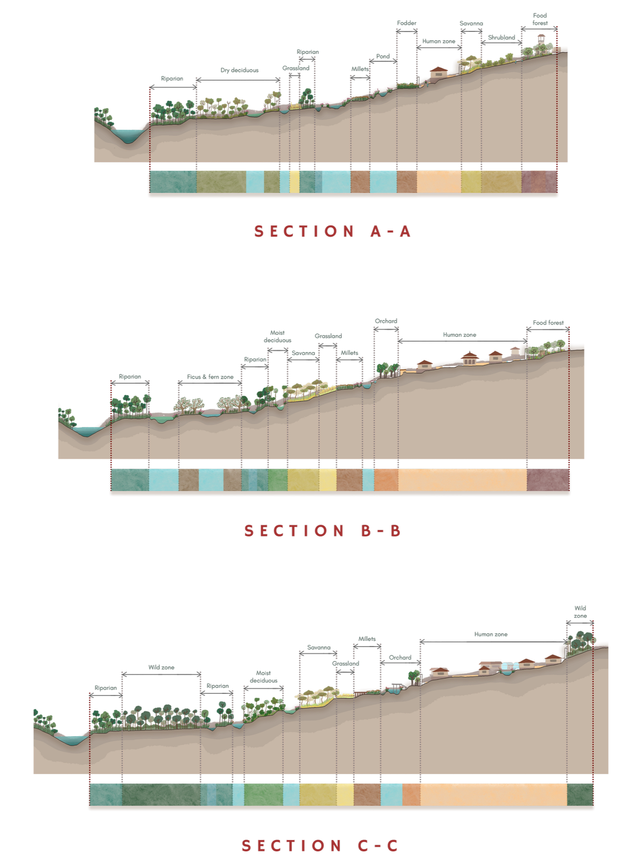 Design cues were drawn from the surrounding forests, including dense canopy patches, grassy clearings, and seasonal as well as perennial streams.