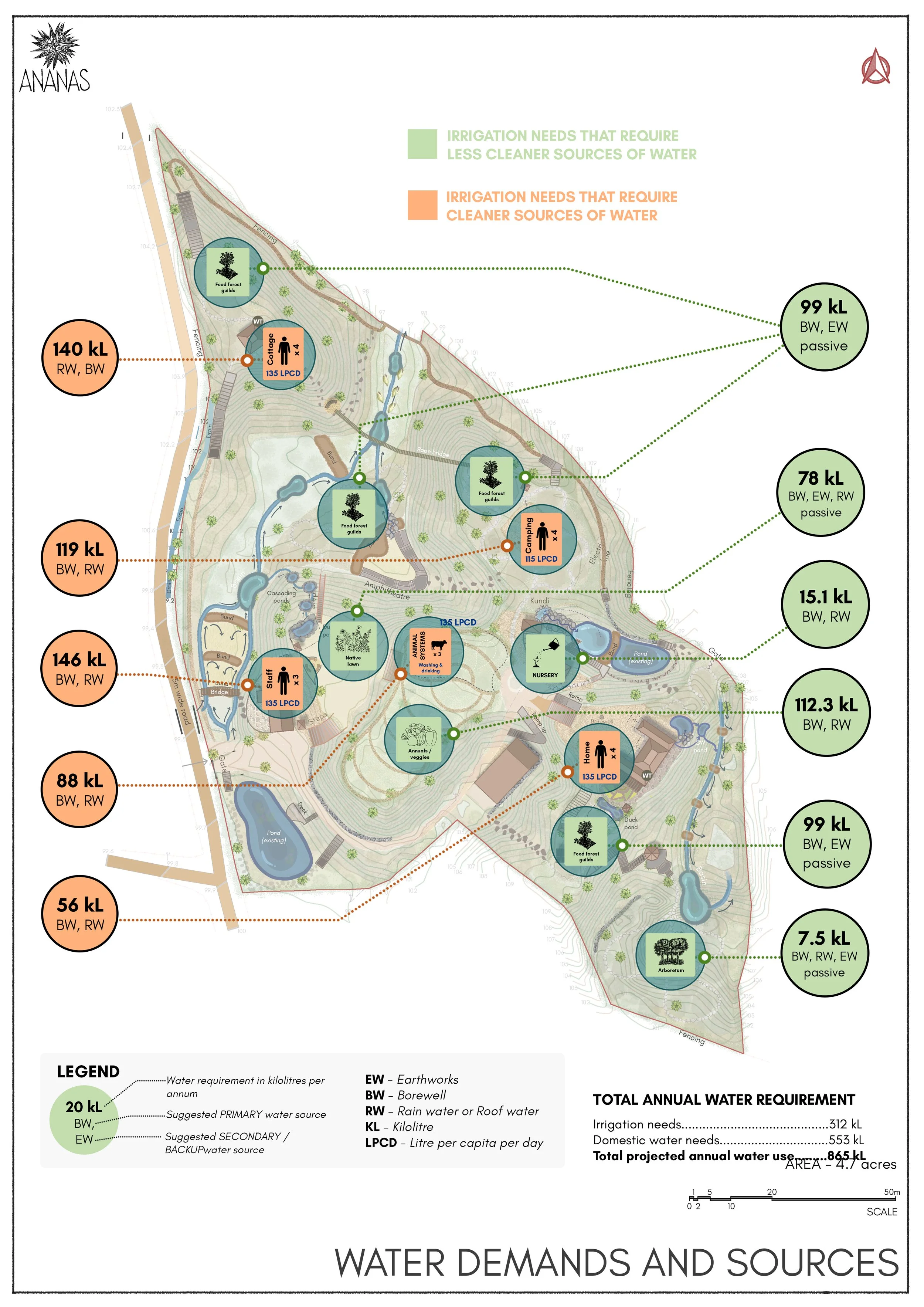 The project set out to transform the land into a resilient, regenerative farm that brings together food forests, productive crops, wild habitats, water bodies, a weekend home, and an Airbnb.