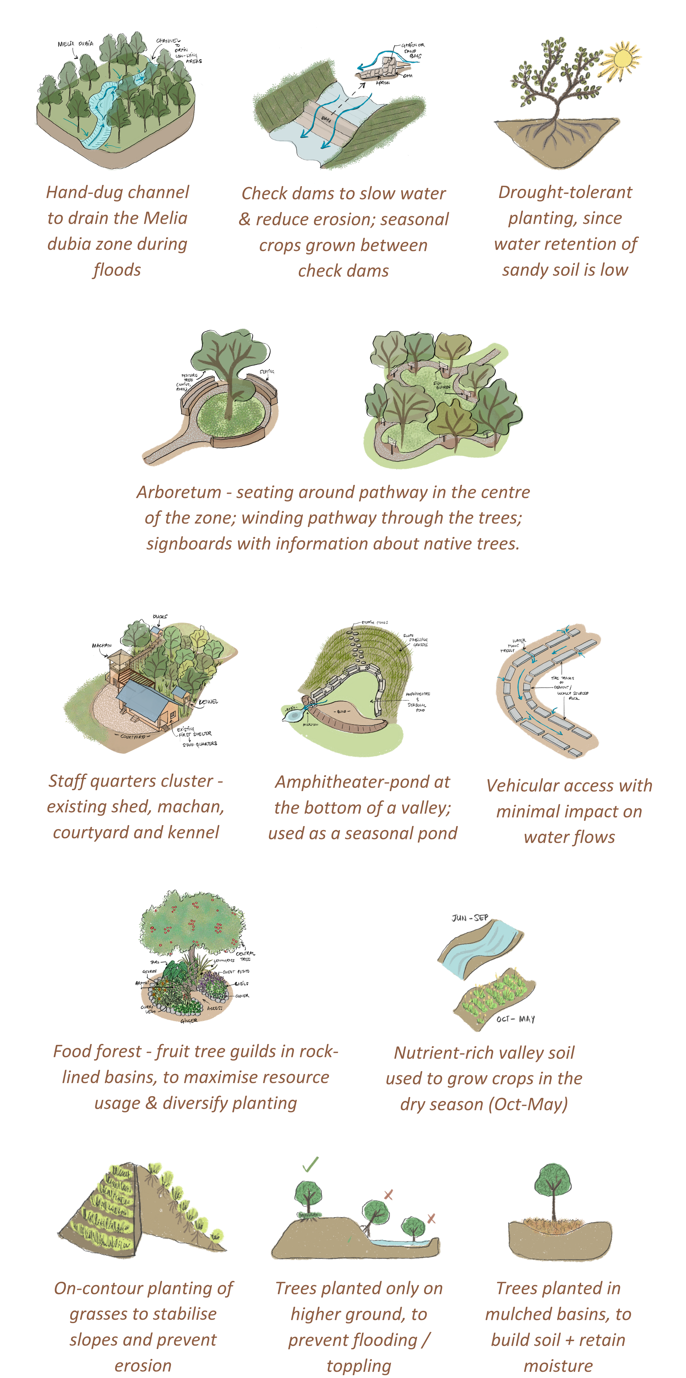 The landscape posed distinct challenges, shaped by a network of steep, narrow ravines that experience seasonal flooding, sandy and erosion-prone soils, severe topsoil loss, and a near absence of native vegetation.