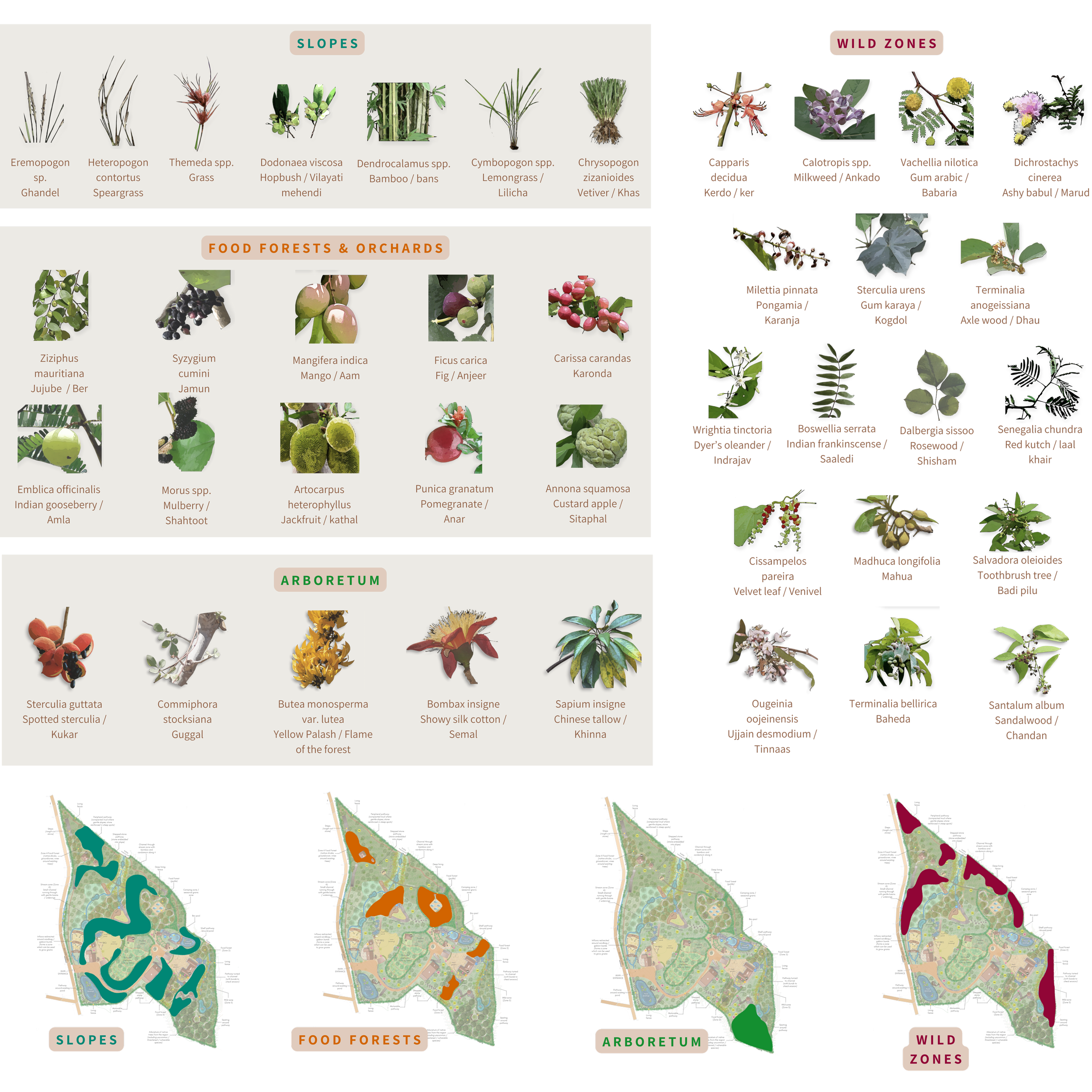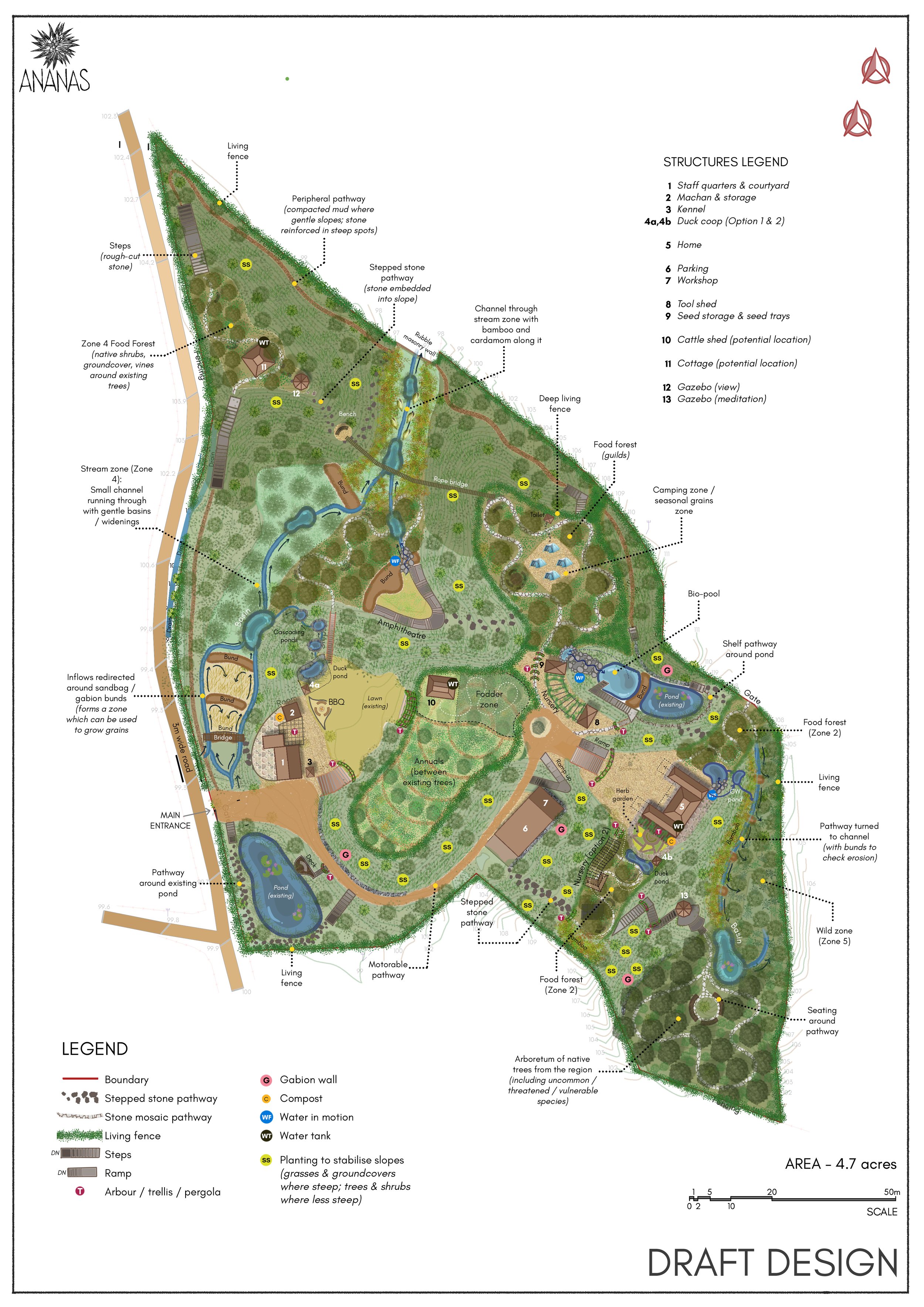 Key features: Masterplan for resilience, flood management, slope stabilisation, wild zones, arboretum, food forest, ponds and basins