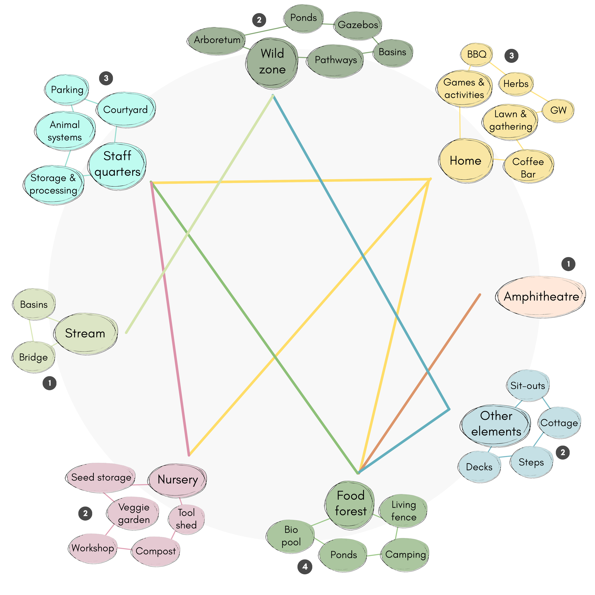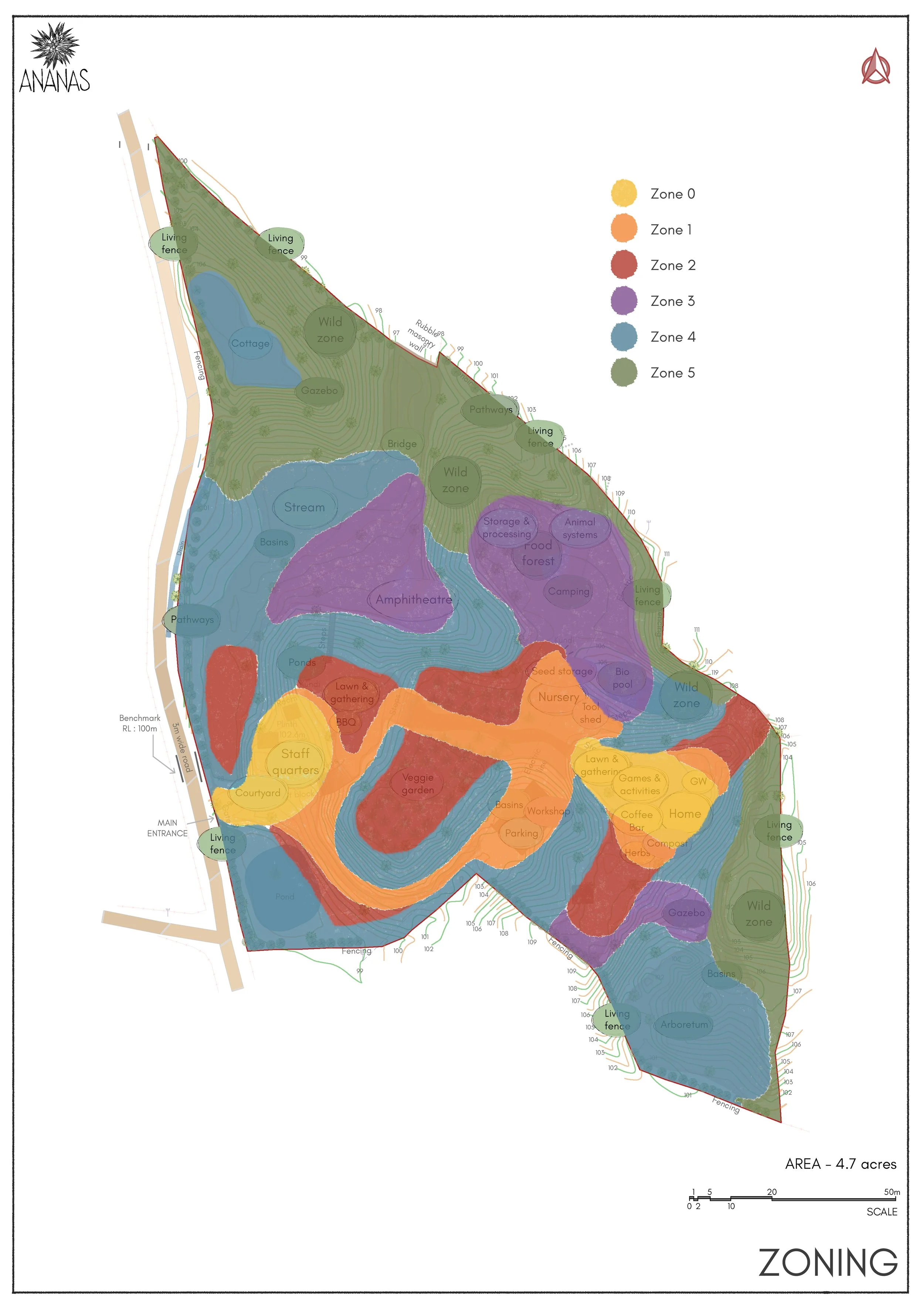 The inputs and outputs of each system element, including resources, energy, food, and ecological services, were carefully mapped. Relationships between elements were strengthened through strategic grouping, stacked functions, and diversification. Drawing on this systems analysis and the site assessment maps, the landscape was organised into six distinct zones. These range from high-activity, high-maintenance human spaces (Zone 0) to protected wild areas dedicated to native biodiversity (Zone 5).