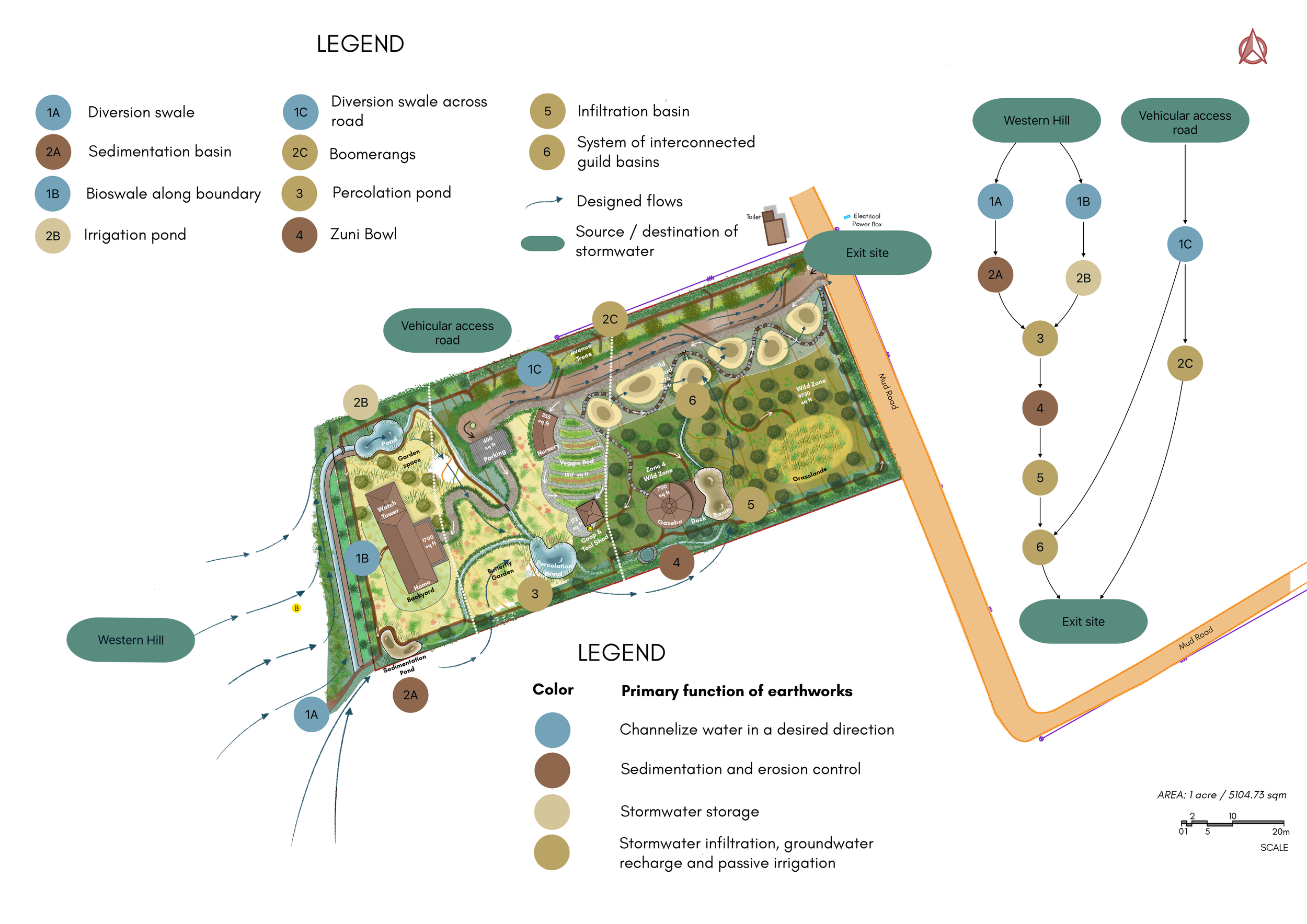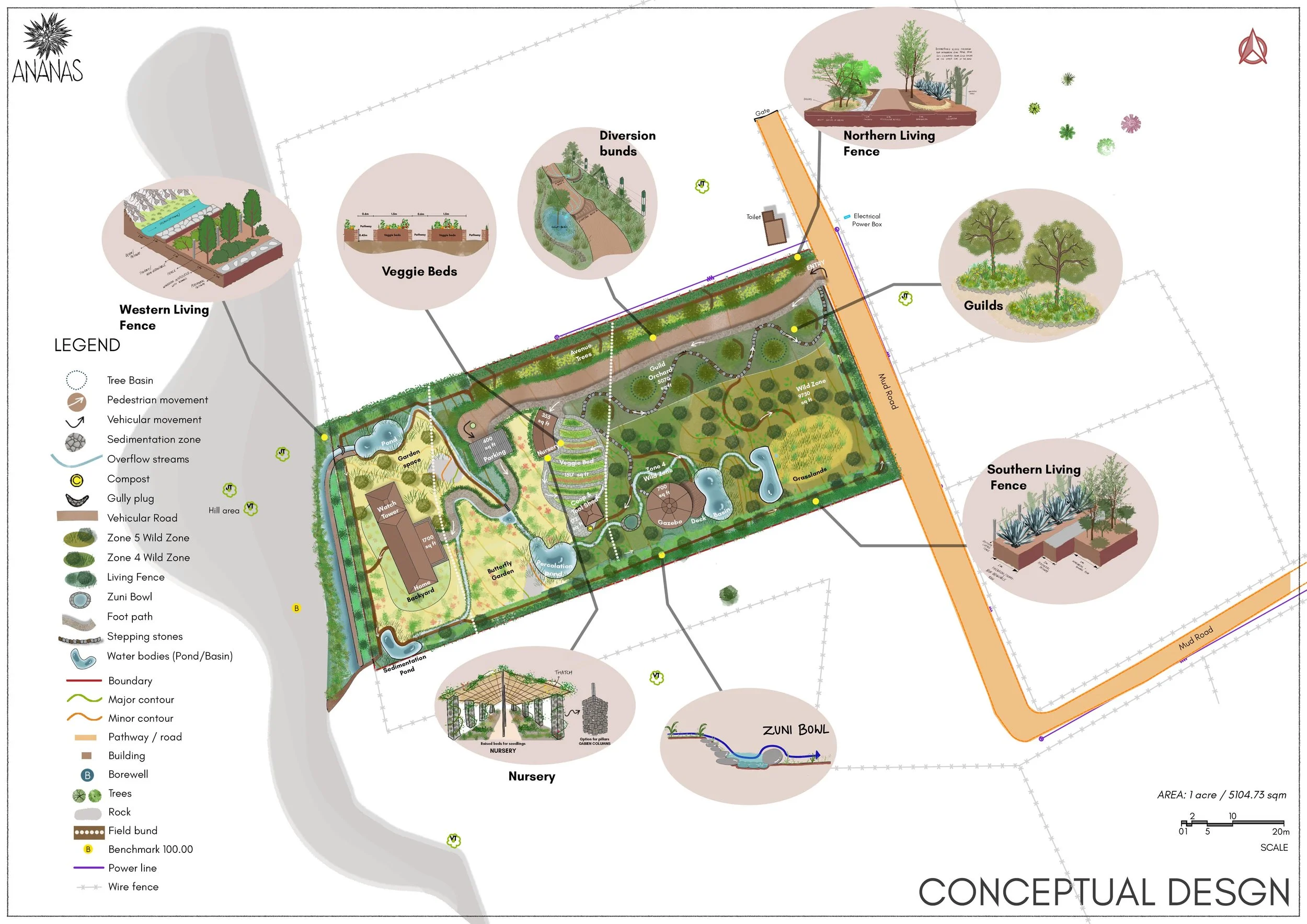 Key features: Regenerative design, wild zone, food forest, earthworks, species diversification