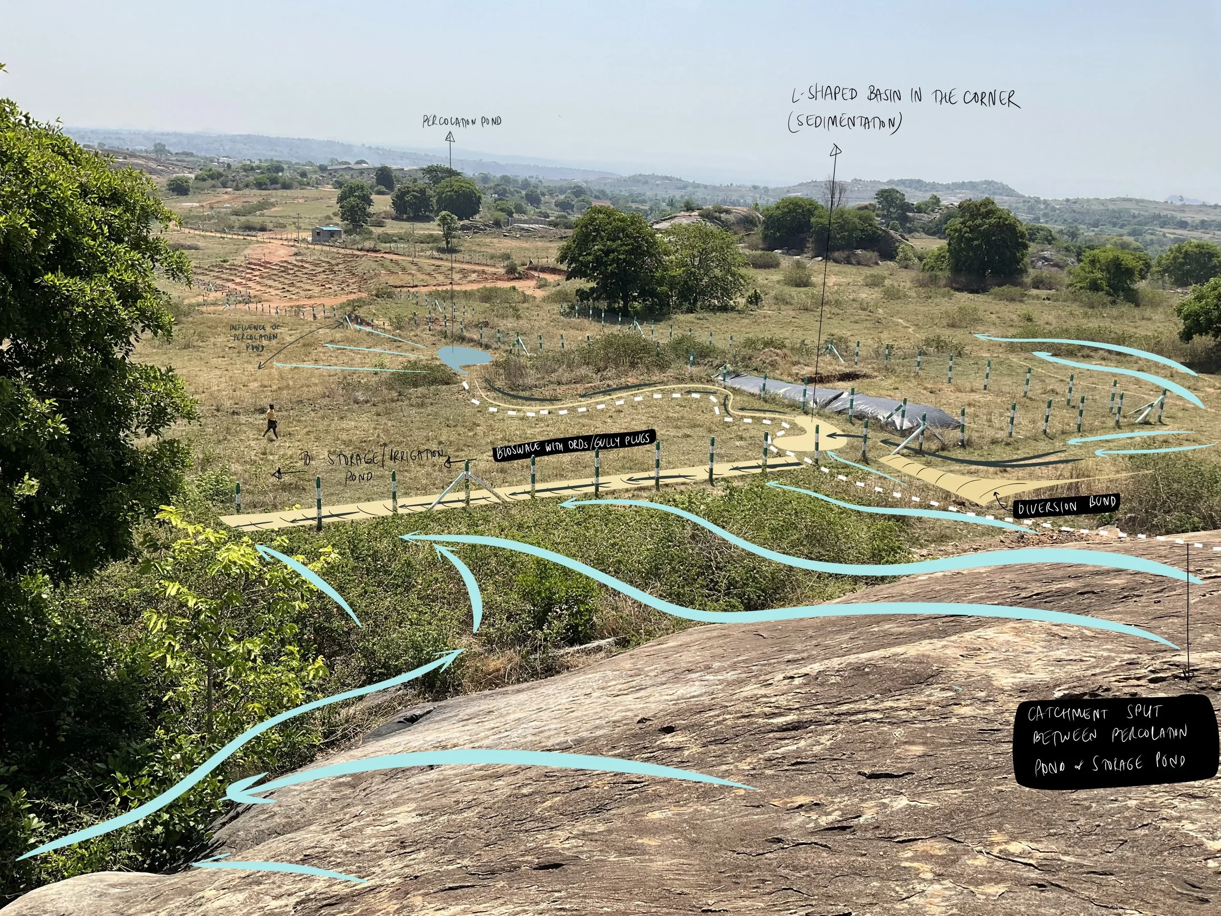 The clients prioritized the preservation of the land and therefore the project vision focused on active restoration of floral biodiversity, regenerative agroforestry, and integrated water management. The vision was brought to life by strategizing the slowing down and infiltration of water from the rock outcrop through ponds, basins and bioswale. The focus for planting was to create a robust native living fence for privacy as well as a barrier that supports life, introduce native species based on the detail study of the bioregion, and to create layered planting systems through Food Forest guilds to introduce edible species that the clients can rely on.