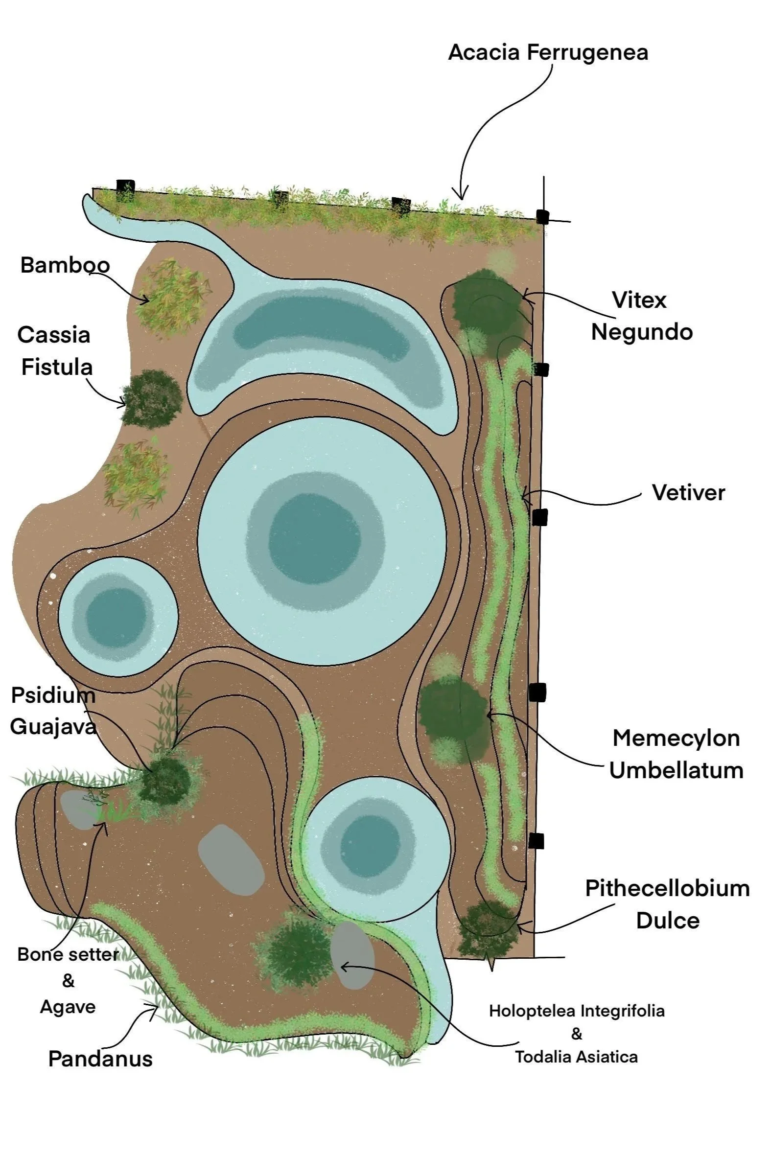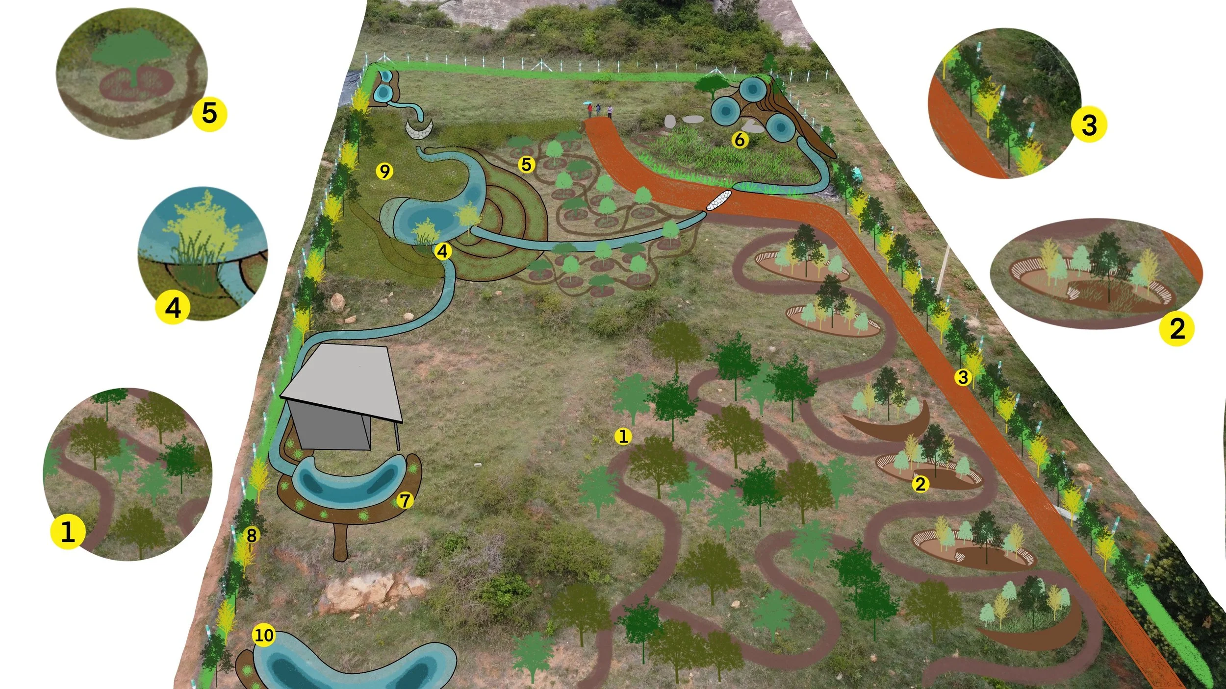 To translate the design vision into reality, the team led the turnkey implementation of earthworks and planting across two site visits. The focus was mainly: