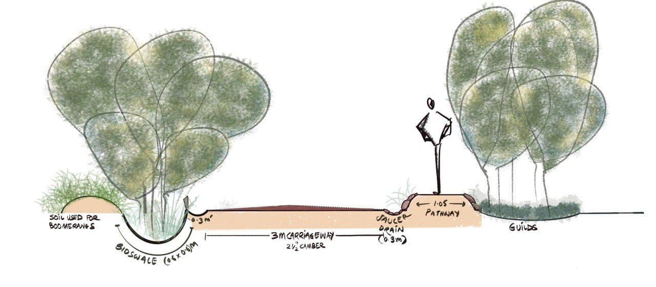Strategic soil management of soil from earthworks by creating raised pathways, pollinator gardens and raised vegetable gardens.